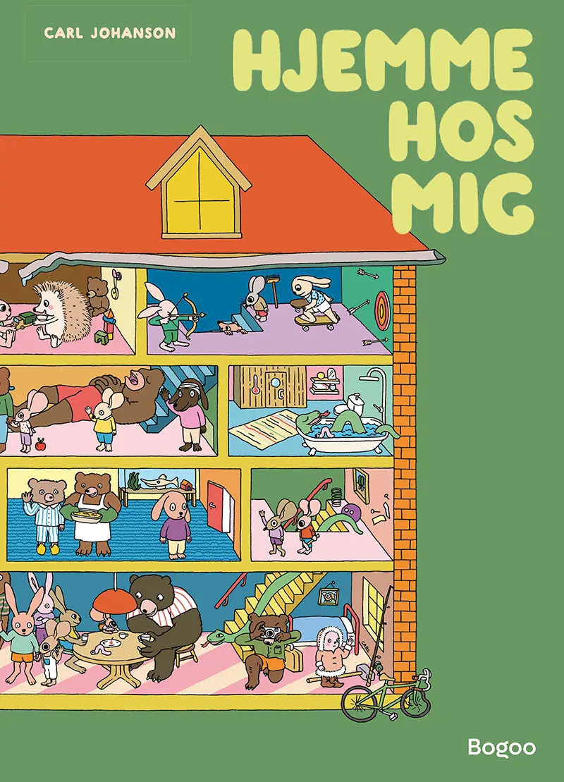 Hjemme hos mig er en varm og humoristisk bog om hjem fyldt med farverige, detaljerede illustrationer.