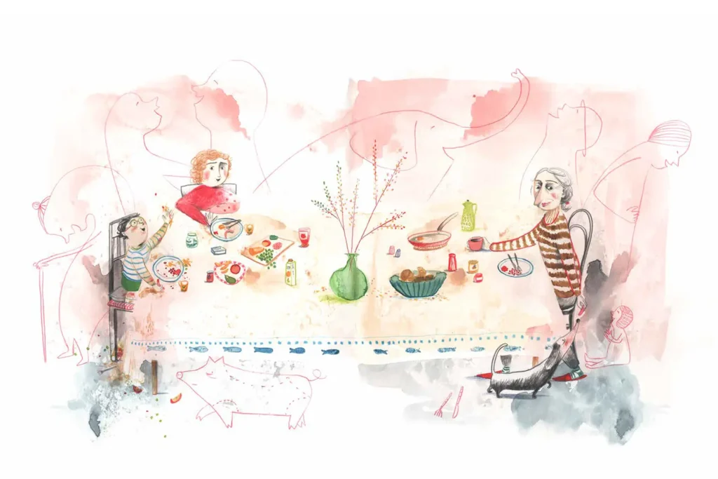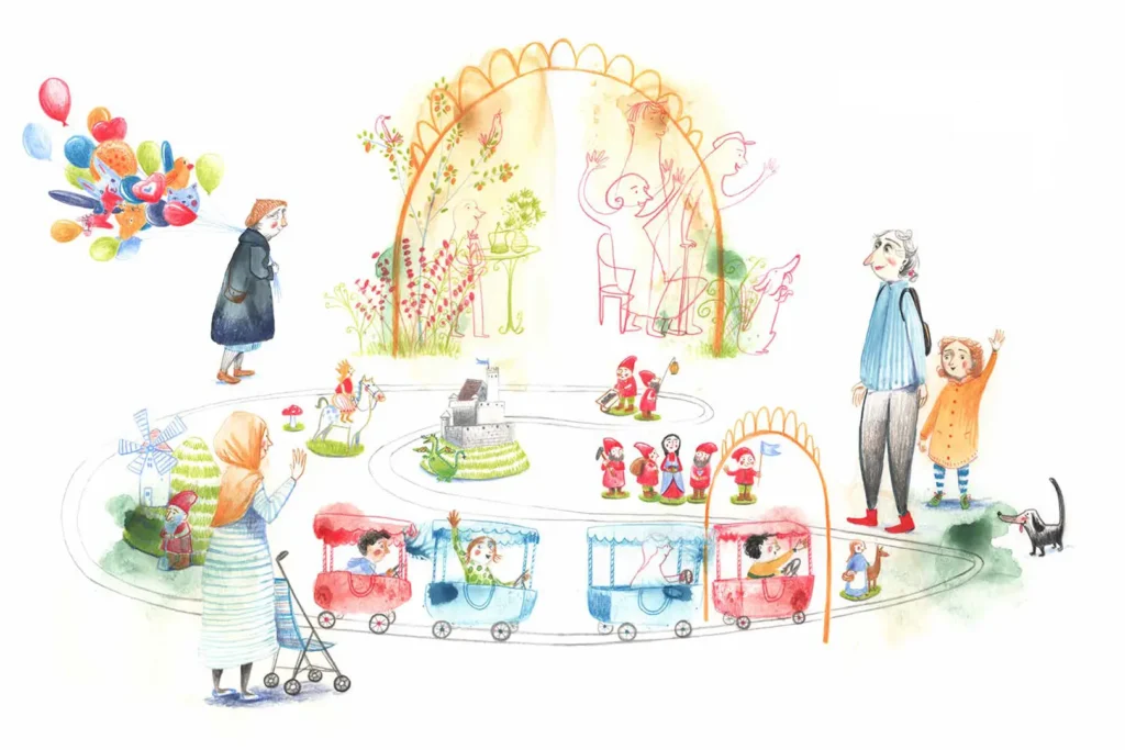 Det giver en følelse af, at det samme scenarie både anskues af et gammelt sind, der husker de grove træk, og et ungt sæt øjne, der ser detaljerne skarpt. Dertil tilføjer Julie Völk spinkle lyserøde konturstreger, der som snarligt udviskede reminiscenser danser i en svindende hukommelses yderste kroge. Den 5-årige og den 90-årige vil lægge mærke til forskellige ting i billederne, men nyde dem med et lige stort smil. Det er umådelig fint, og der er store mængder varme og humor at finde i billederne – for det er vel dét, uanset alder eller generation, det hele handler om?
