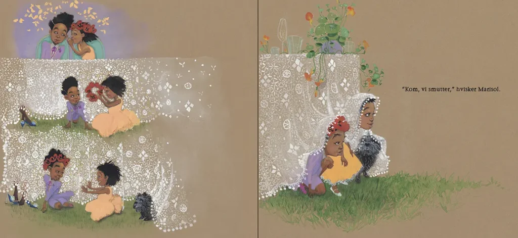 Det er pastelfarver. Jessica Love formår at tegne blondedugen så skrøbelig, som den er, og hun giver Marisols kjole en helt lysende orange. Smukt – og meget pastel-poetisk.