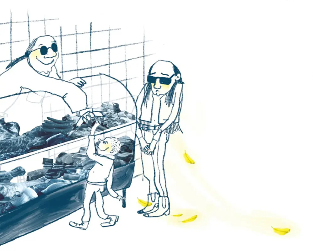 Her kan man virkelig tale om, at illustrationerne lægger et ekstra lag på historien. Katrine Louise Jakobsens geniale illustrationer blander virkelige fotos med hendes skæve streg i sort-grå nuancer, med et strejf af gult på alle illustrationer. Det giver et helt særligt spil til illustrationerne, og jeg begejstres over de på alle måder skæve figurer med klare ansigtsudtryk.