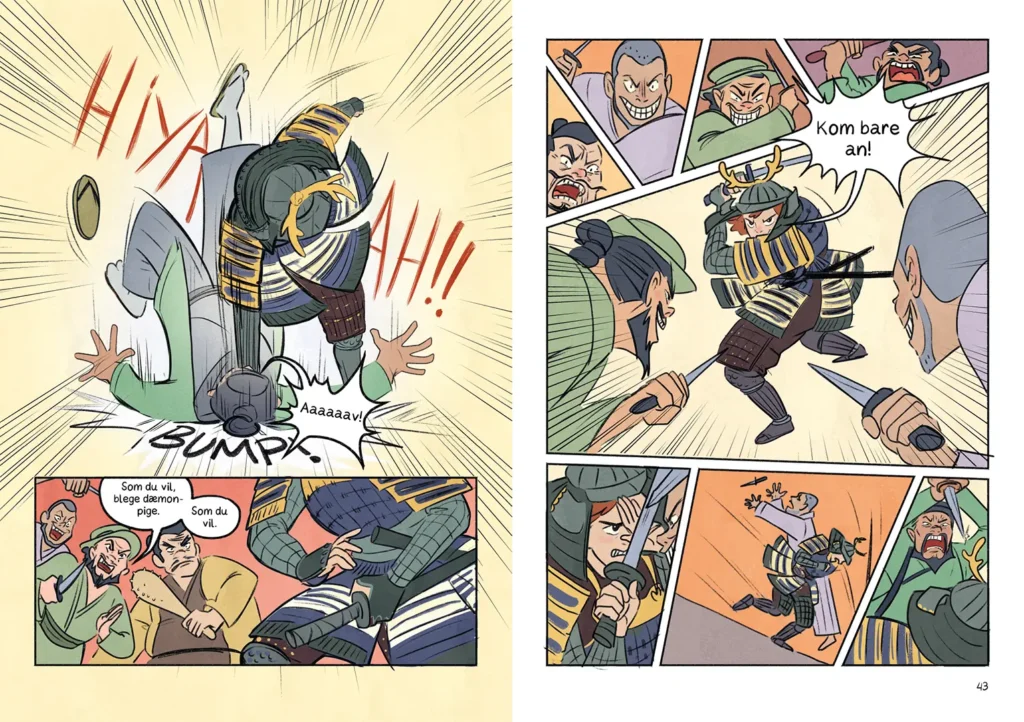 Tegneserien er fantastisk action på papir. Skiftene mellem frø- og fugleperspektiv giver onde japanske mænd og der er masser af BOOOM og SLAAAM og BOING. Der er tegneserieruder og helsidesbilleder. Der veksles i tidsforløb, og der er indsat kommentarer sammen med masser af hårdtslående dialog. Det er en fremragende tegneserie, – man altså: det kan anbefales at læse faktadelen først. Så kender man til Nationalmuseets samurai-samling, men kender til samurai-rustningen våben, or historie.